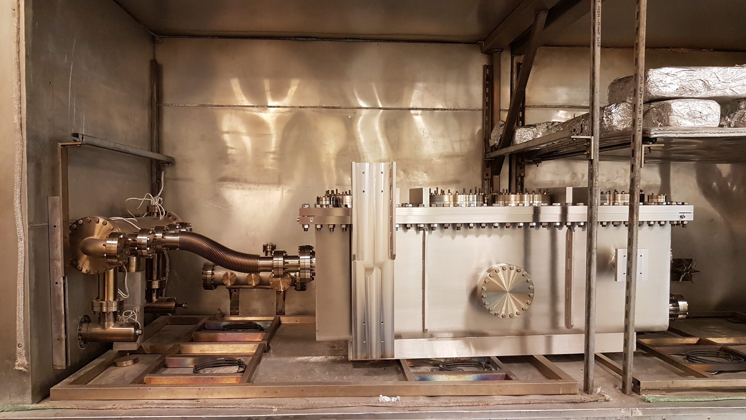 We have a purpose built bake out oven 3.4 by 1.5 meters. A bake out is an effective way of removing surface contamination from your vacuum system that would otherwise desorb slowly when the system is under vacuum preventing ultra-high vacuum (UHV ) pressures from being reached.